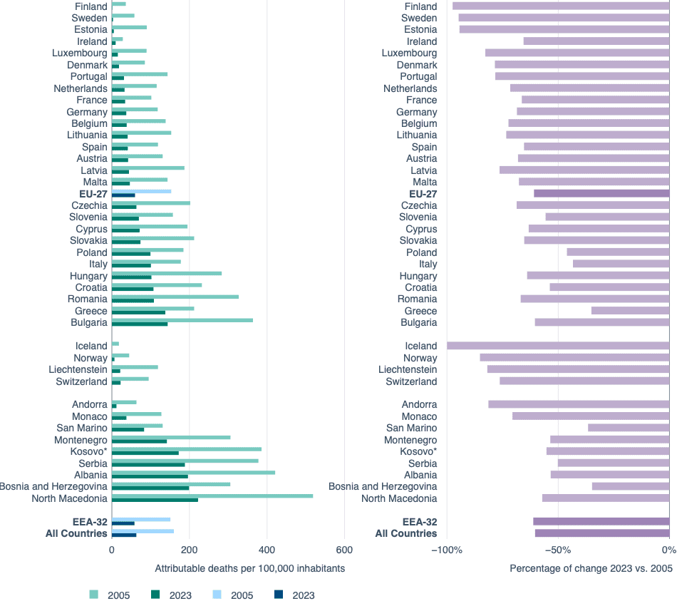 Από το 2011, όλες οι χώρες της ΕΕ έχουν μειώσει την έκθεση του αστικού πληθυσμού τους στα σωματίδια PM2.5. Ωστόσο, η συντριπτική πλειοψηφία (πάνω από 90%) του αστικού πληθυσμού της ΕΕ εξακολουθεί να εκτίθεται σε συγκεντρώσεις PM2.5 που υπερβαίνουν το επίπεδο που ορίζει ο Παγκόσμιος Οργανισμός Υγείας, γεγονός που υπογραμμίζει την ανάγκη λήψης πρόσθετων μέτρων για τη μείωση των σχετικών κινδύνων για την υγεία.