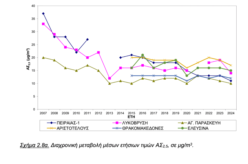 Διαχρονική μεταβολή μέσων ετήσιων τιμών PM2.5, σε μg/m3: