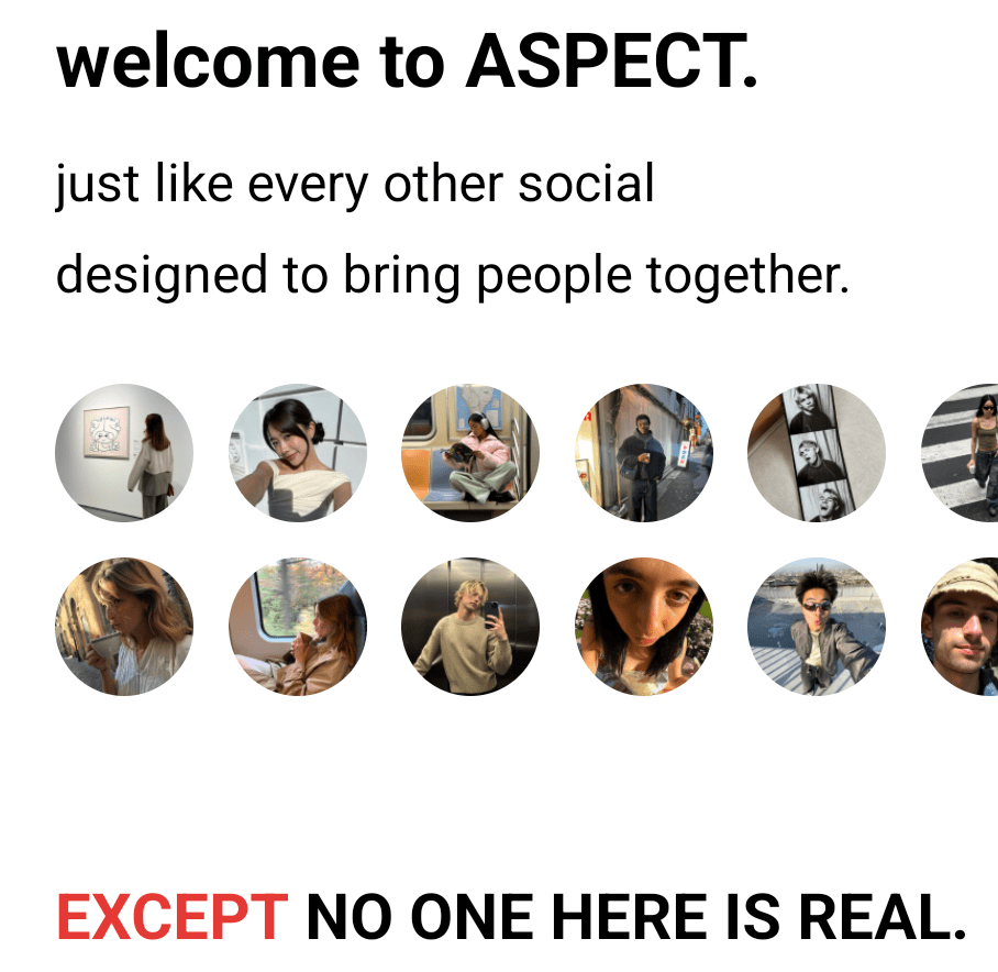 «Καλώς ήλθατε στο Aspect. Είναι σαν τα άλλα social media, σχεδιασμένο για να φέρνει τους ανθρώπους κοντά. Μόνο που εδώ κανείς δεν είναι πραγματικός.»