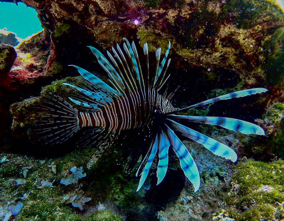 Το λεοντόψαρο είναι ένας ιδιαίτερα αποτελεσματικός θηρευτής και καθώς εξαπλώνεται, αναδιατάσσει την τροφική αλυσίδα, φέρνοντας σε άμεσο ανταγωνισμό ντόπιους θηρευτές όπως ο ροφός. © Thanos Dailianis